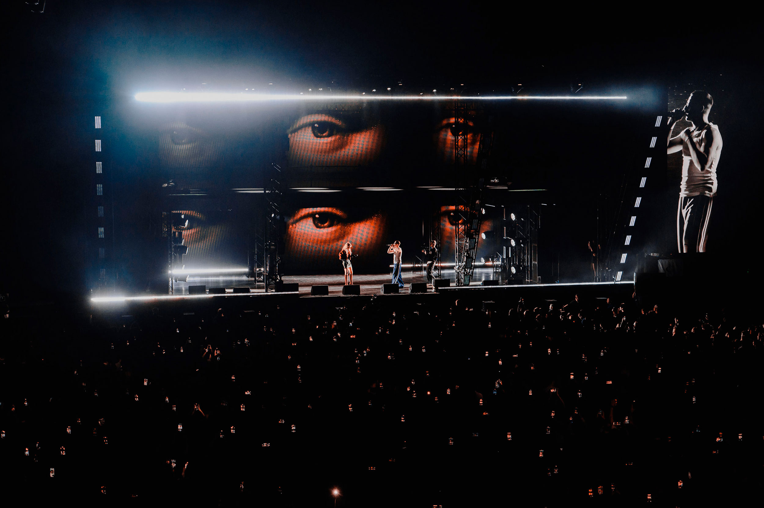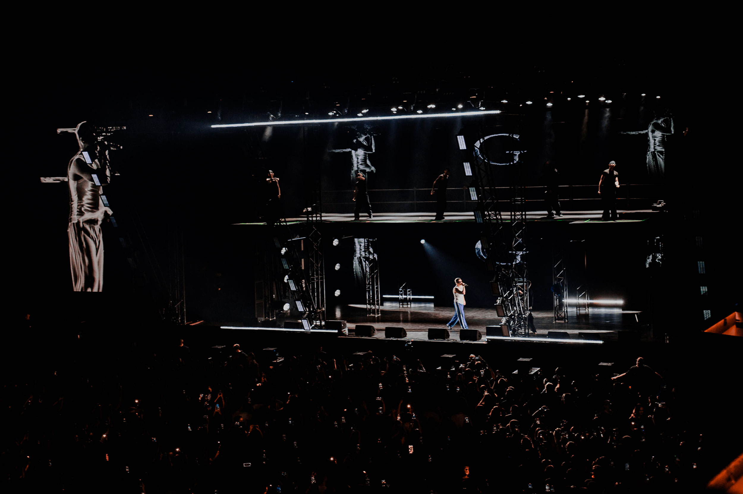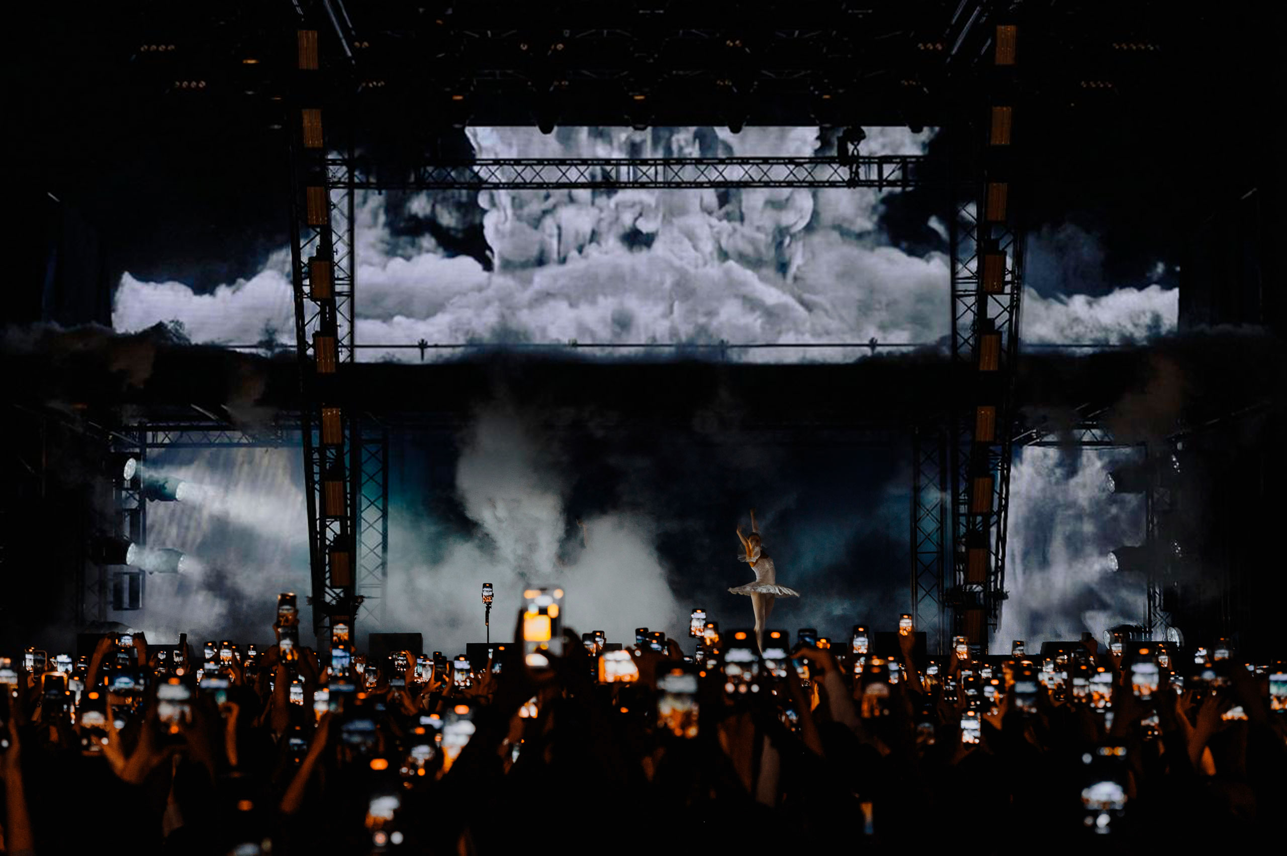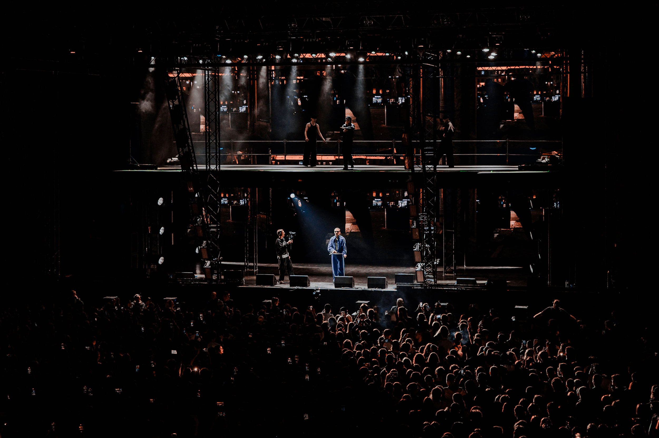 Разработать сценический дизайн с двухэтажной конструкцией: верхний ярус работает как площадка для хореографии, нижний — как площадка для артиста. Объём передать ультрареалистичным контентом на экранах и плотной дымкой, чтобы световые лучи «резали» пространство слоями и усиливали глубину сцены.
