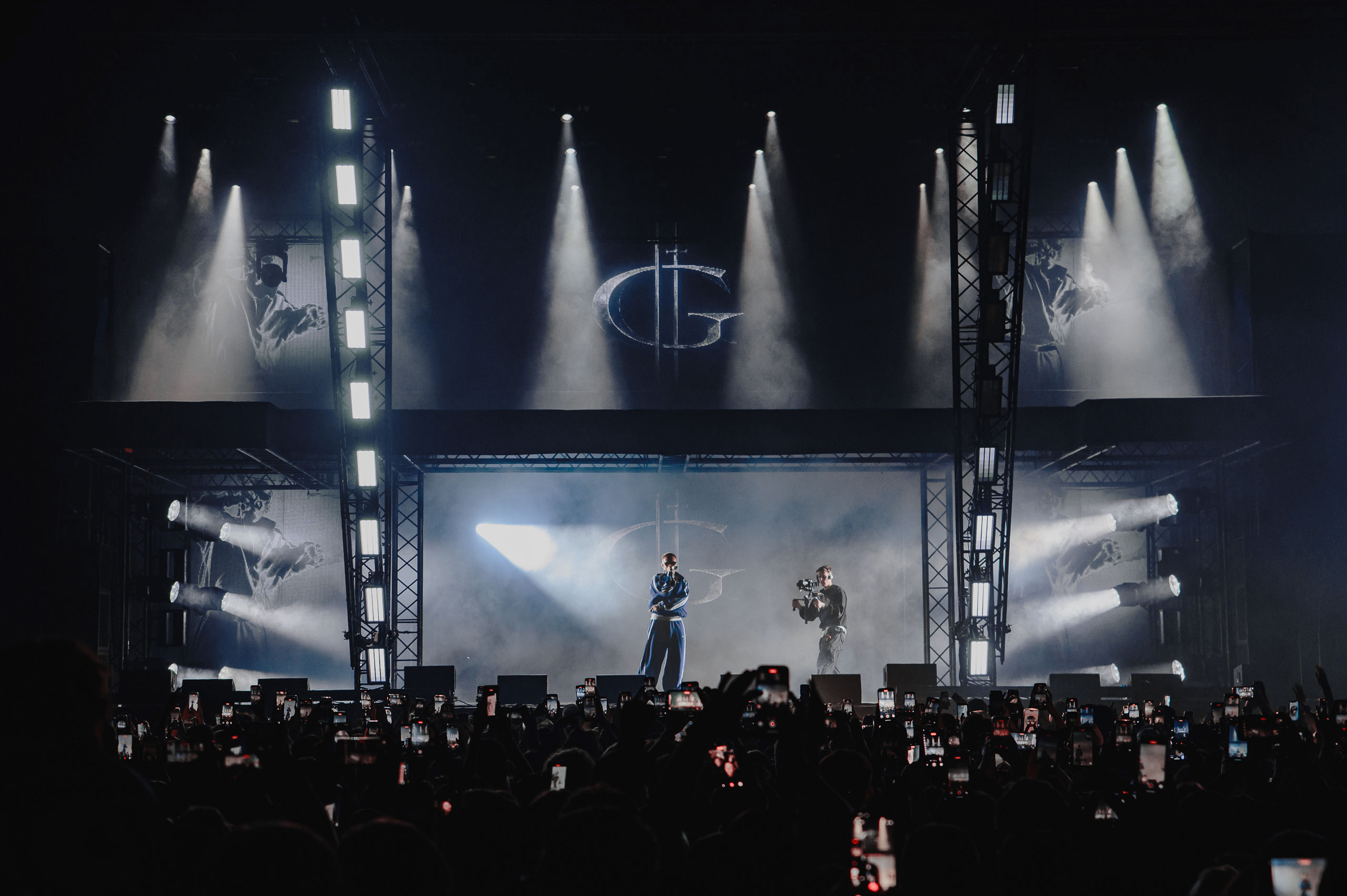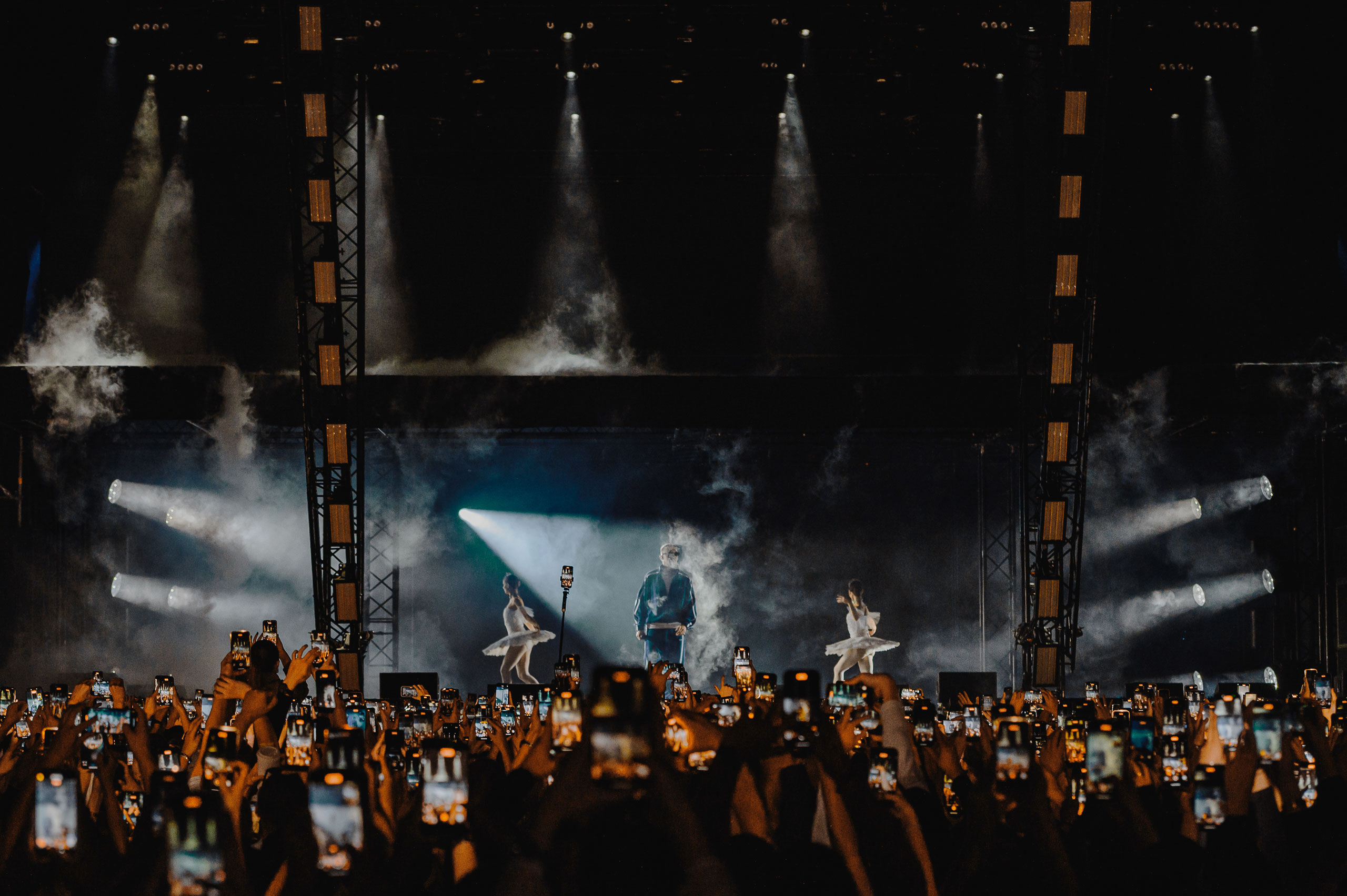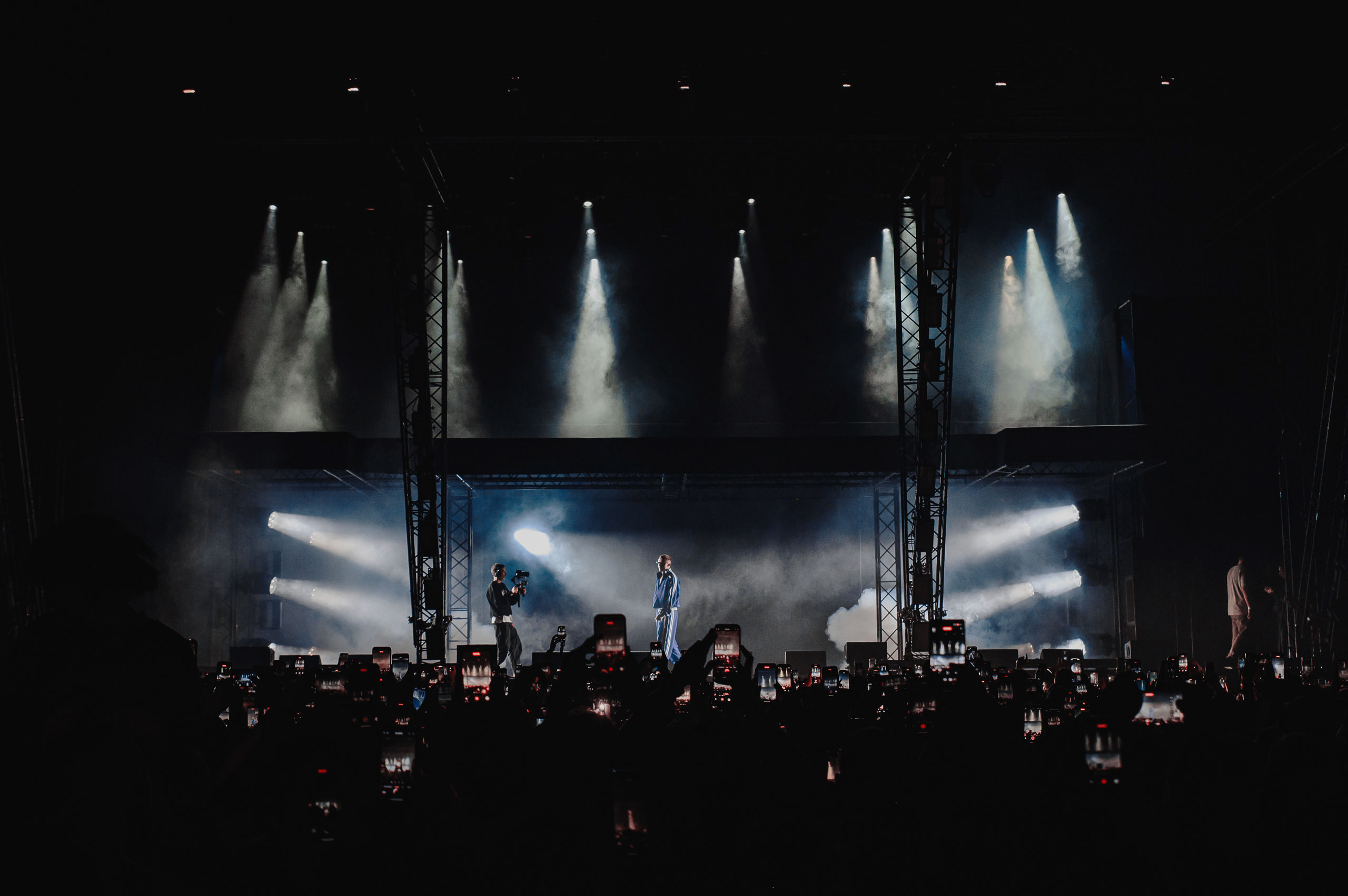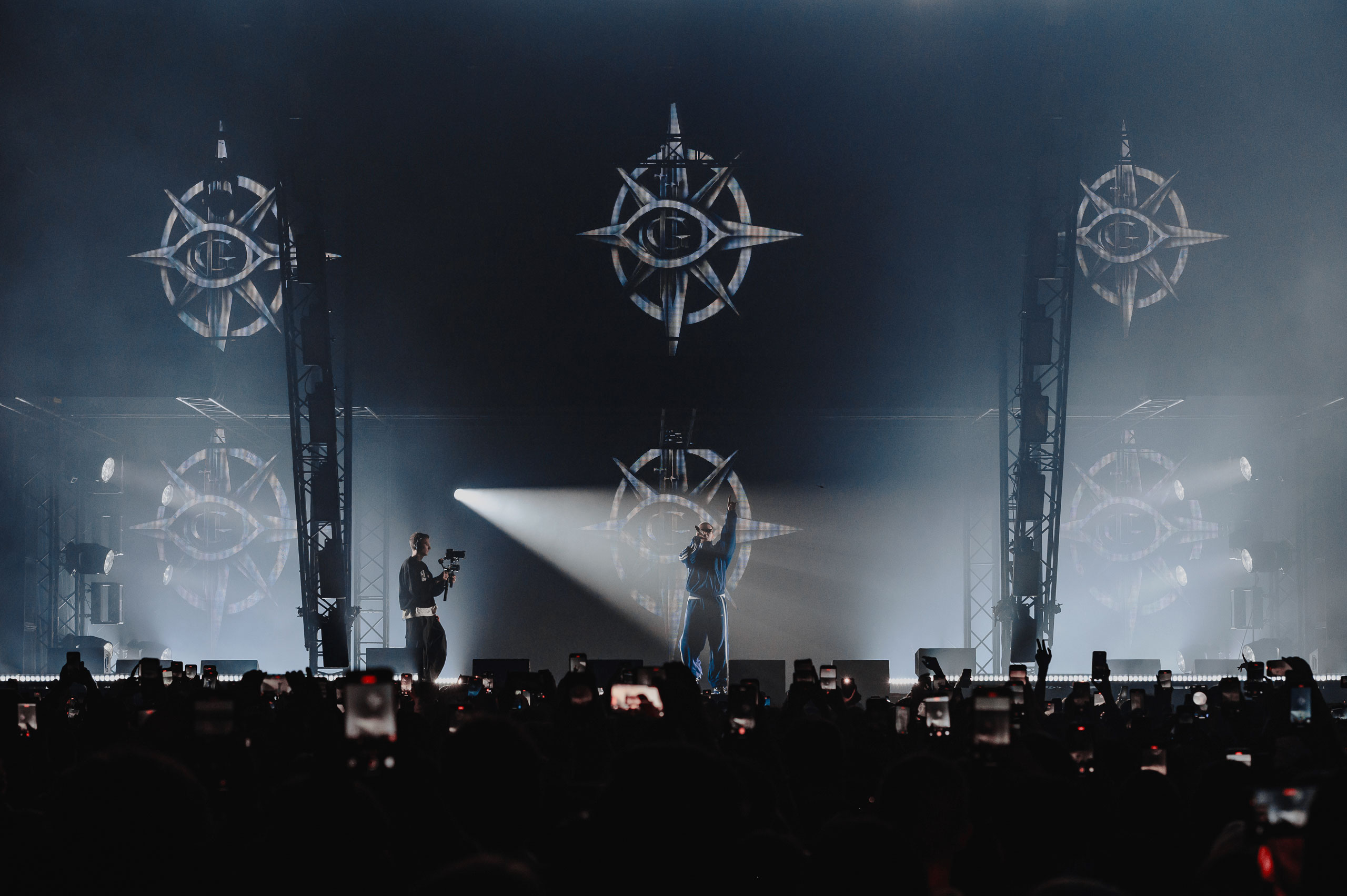 Разработать сценический дизайн с двухэтажной конструкцией: верхний ярус работает как площадка для хореографии, нижний — как площадка для артиста. Объём передать ультрареалистичным контентом на экранах и плотной дымкой, чтобы световые лучи «резали» пространство слоями и усиливали глубину сцены.