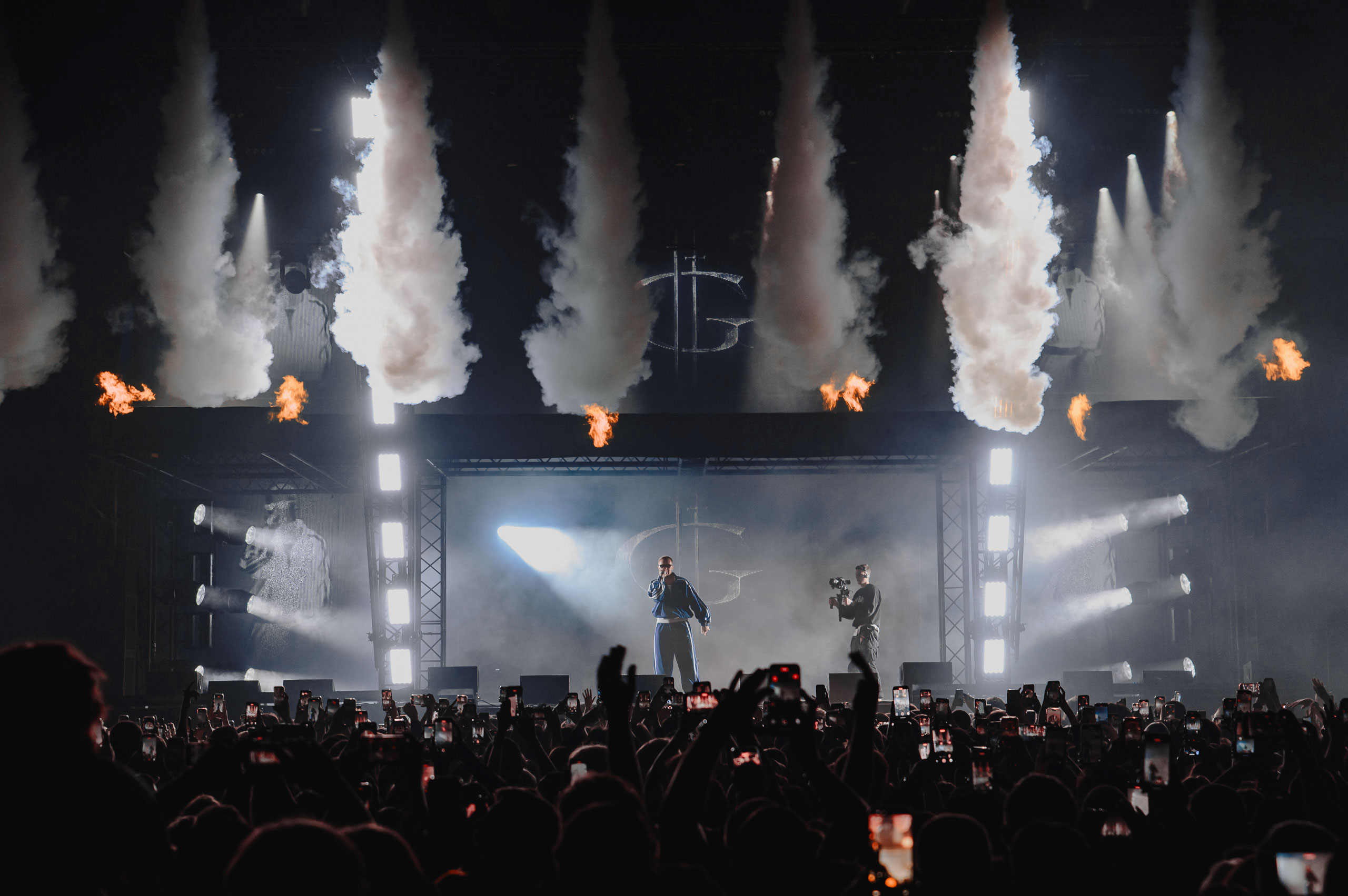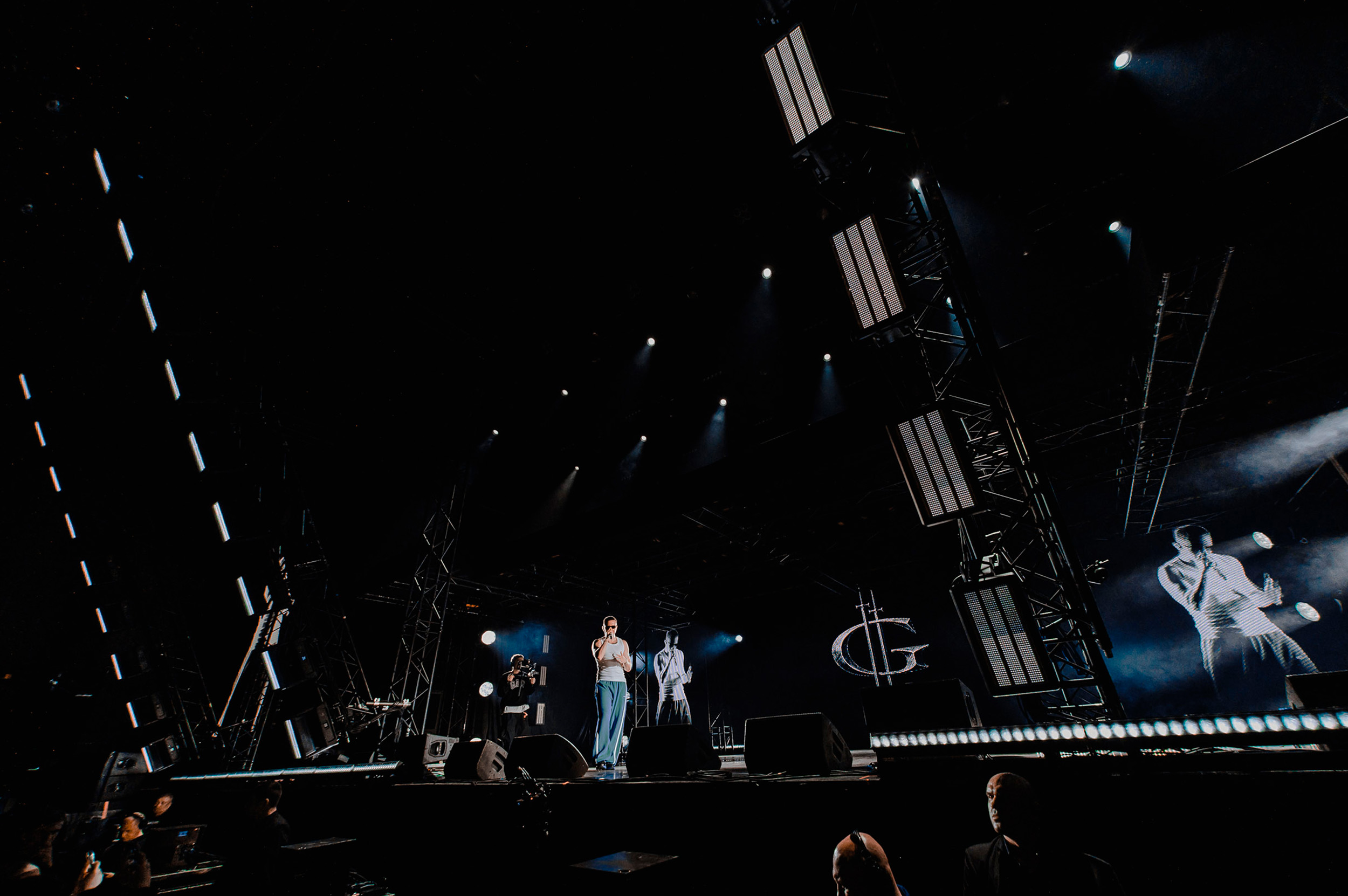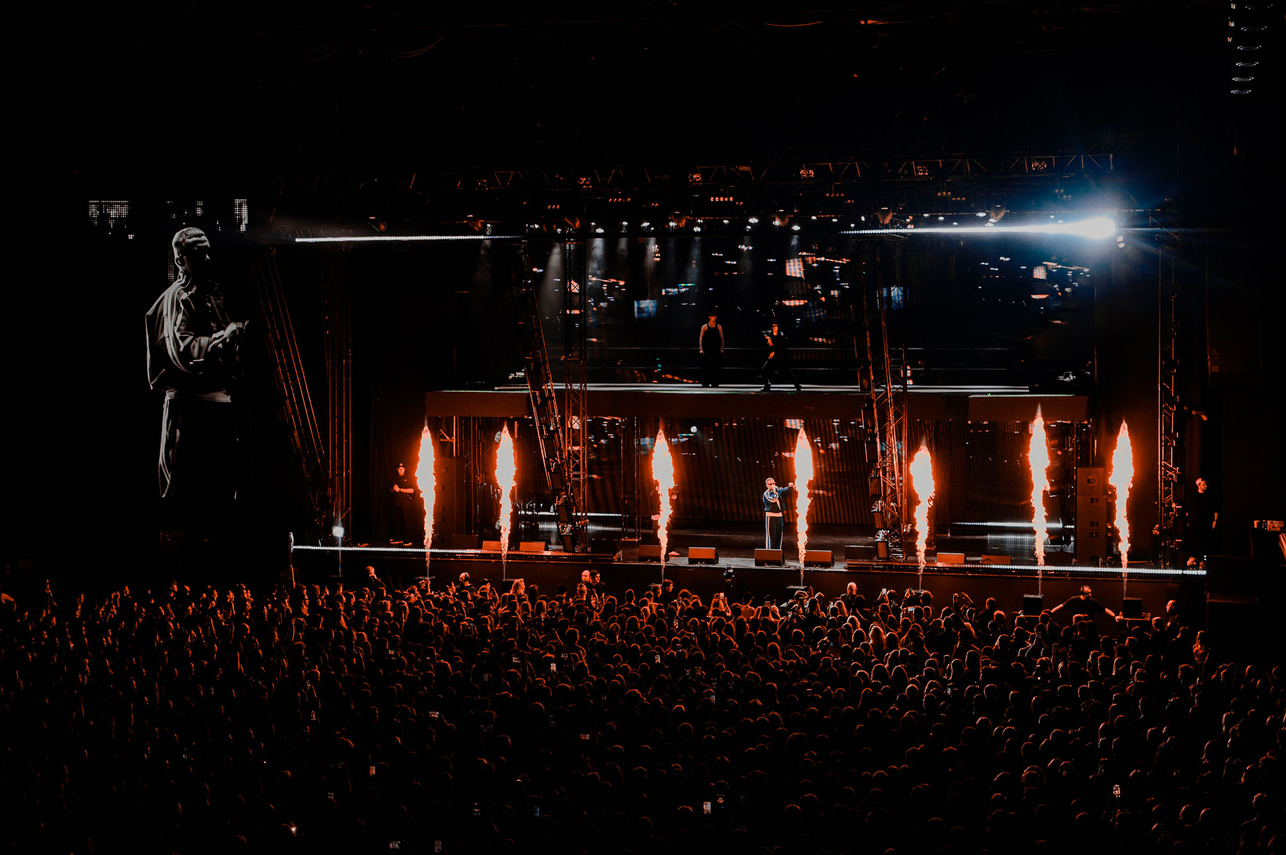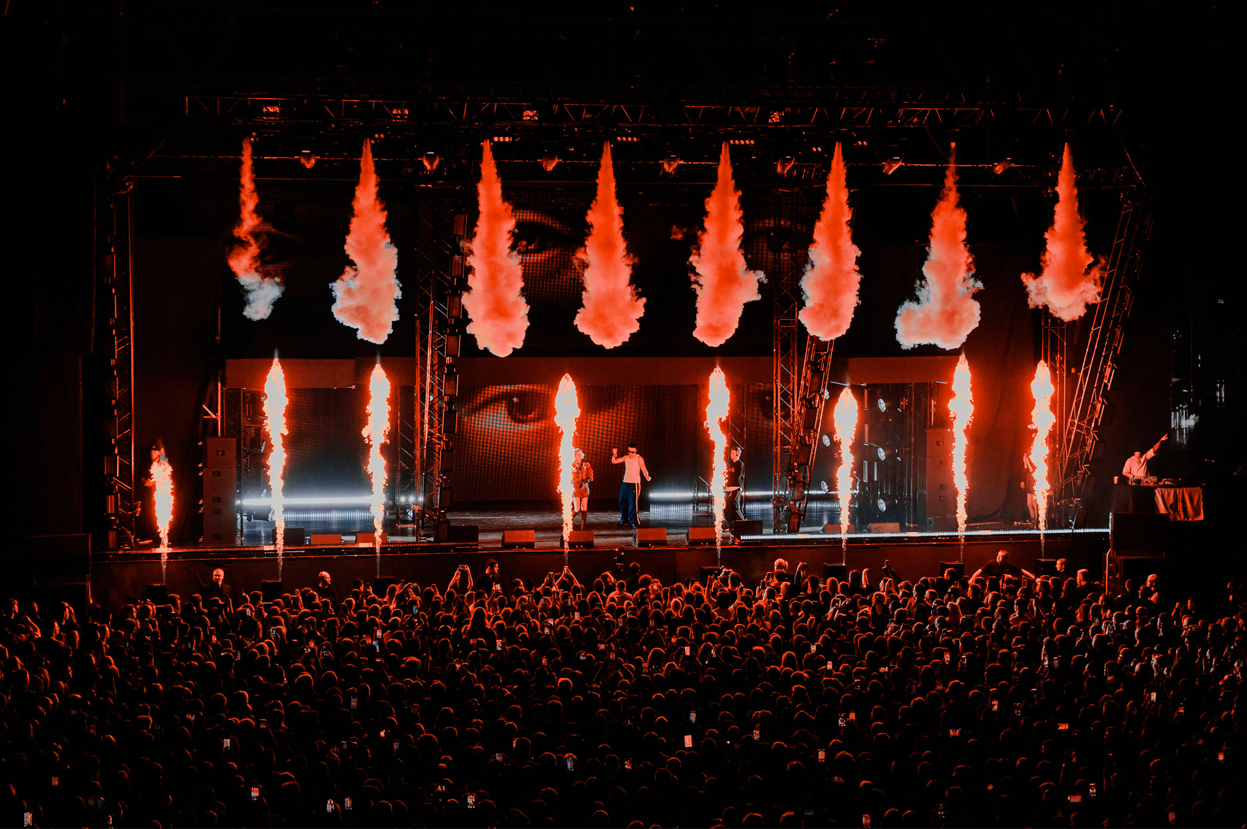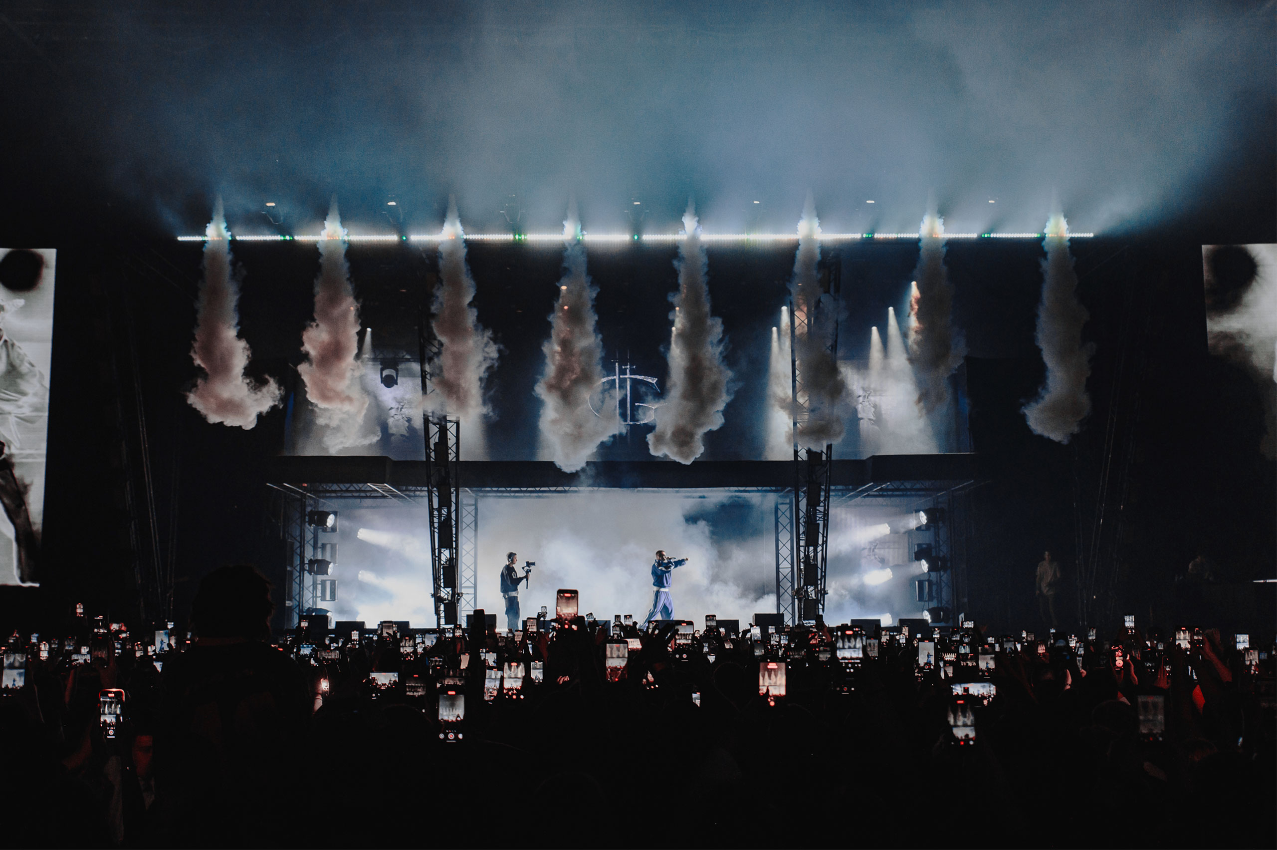 Разработать сценический дизайн с двухэтажной конструкцией: верхний ярус работает как площадка для хореографии, нижний — как площадка для артиста. Объём передать ультрареалистичным контентом на экранах и плотной дымкой, чтобы световые лучи «резали» пространство слоями и усиливали глубину сцены.