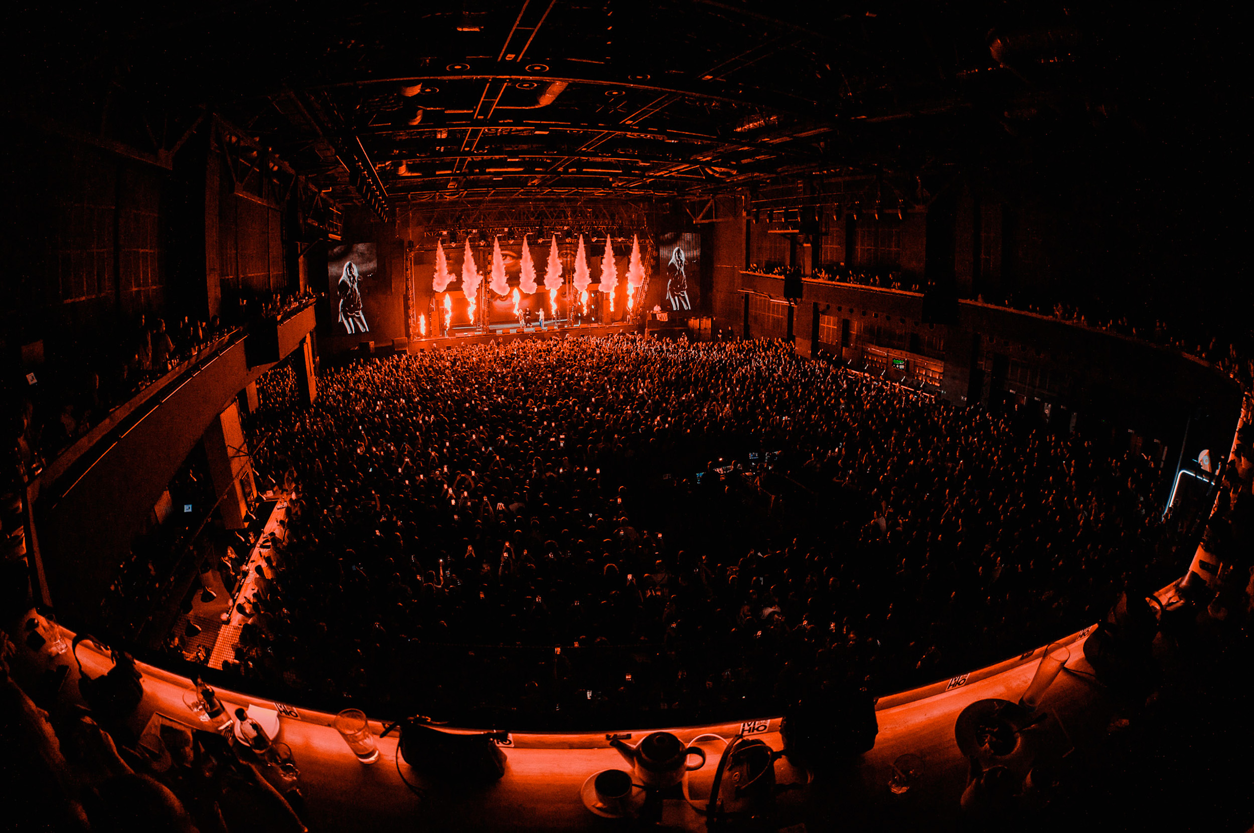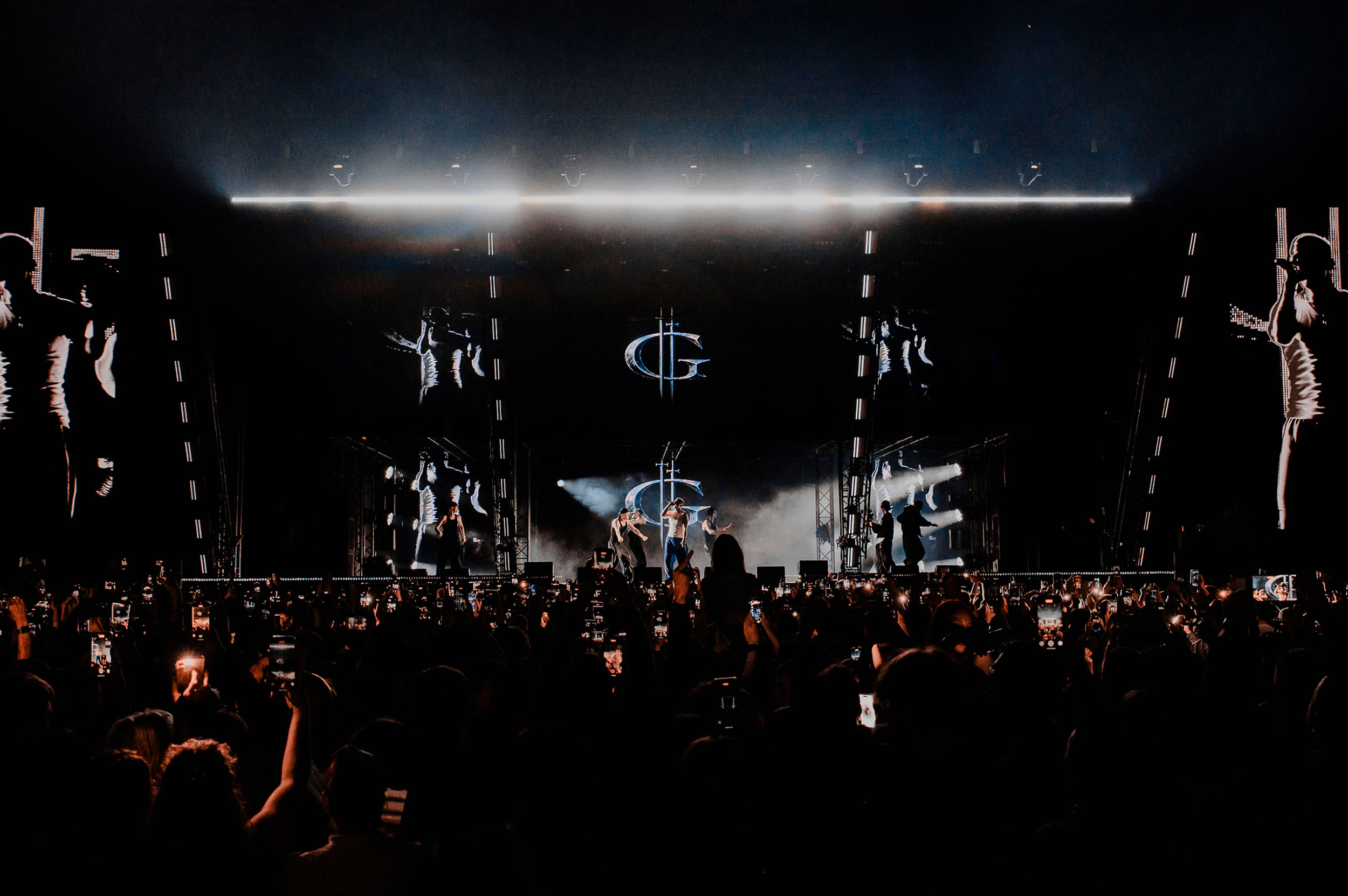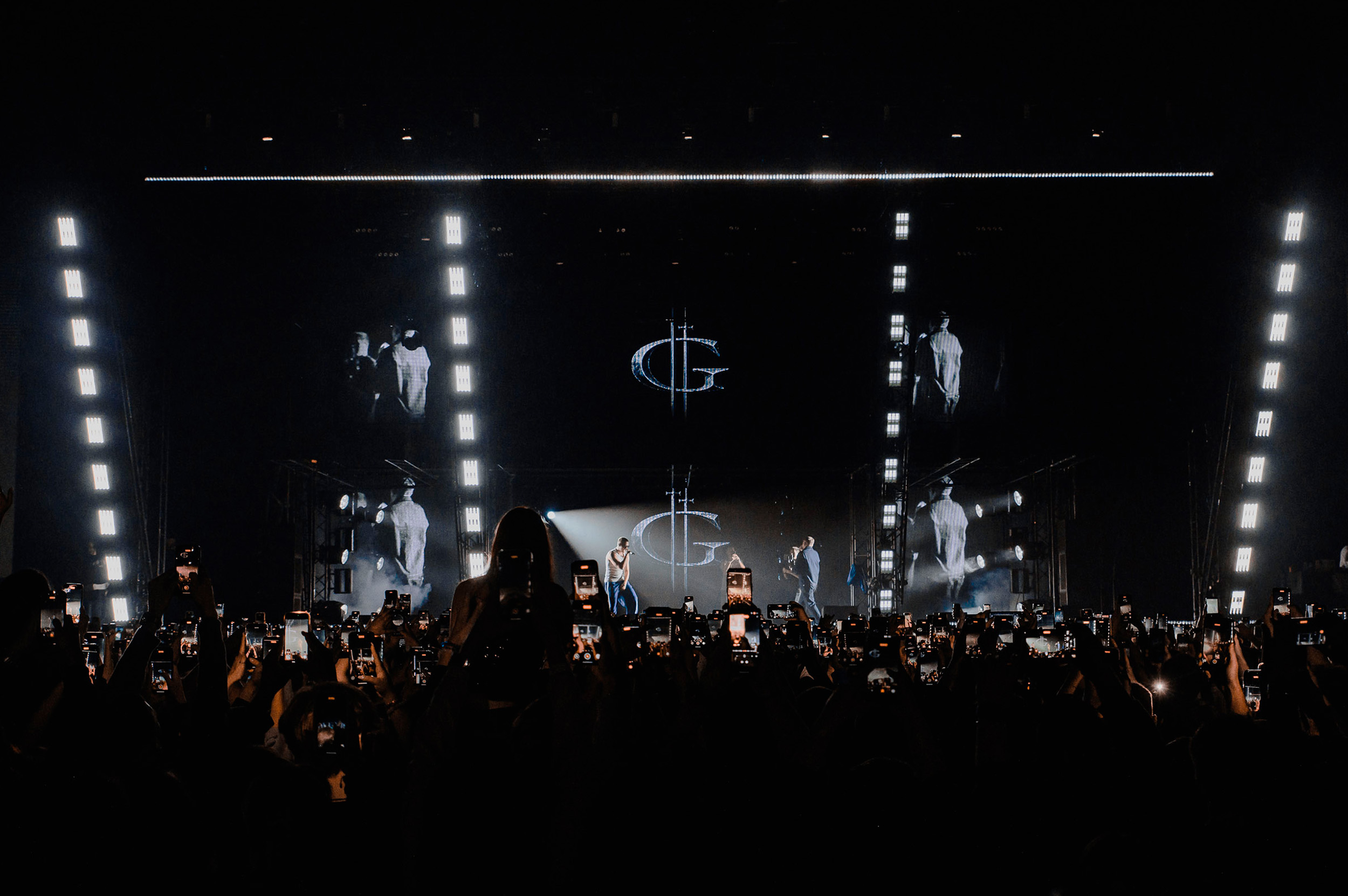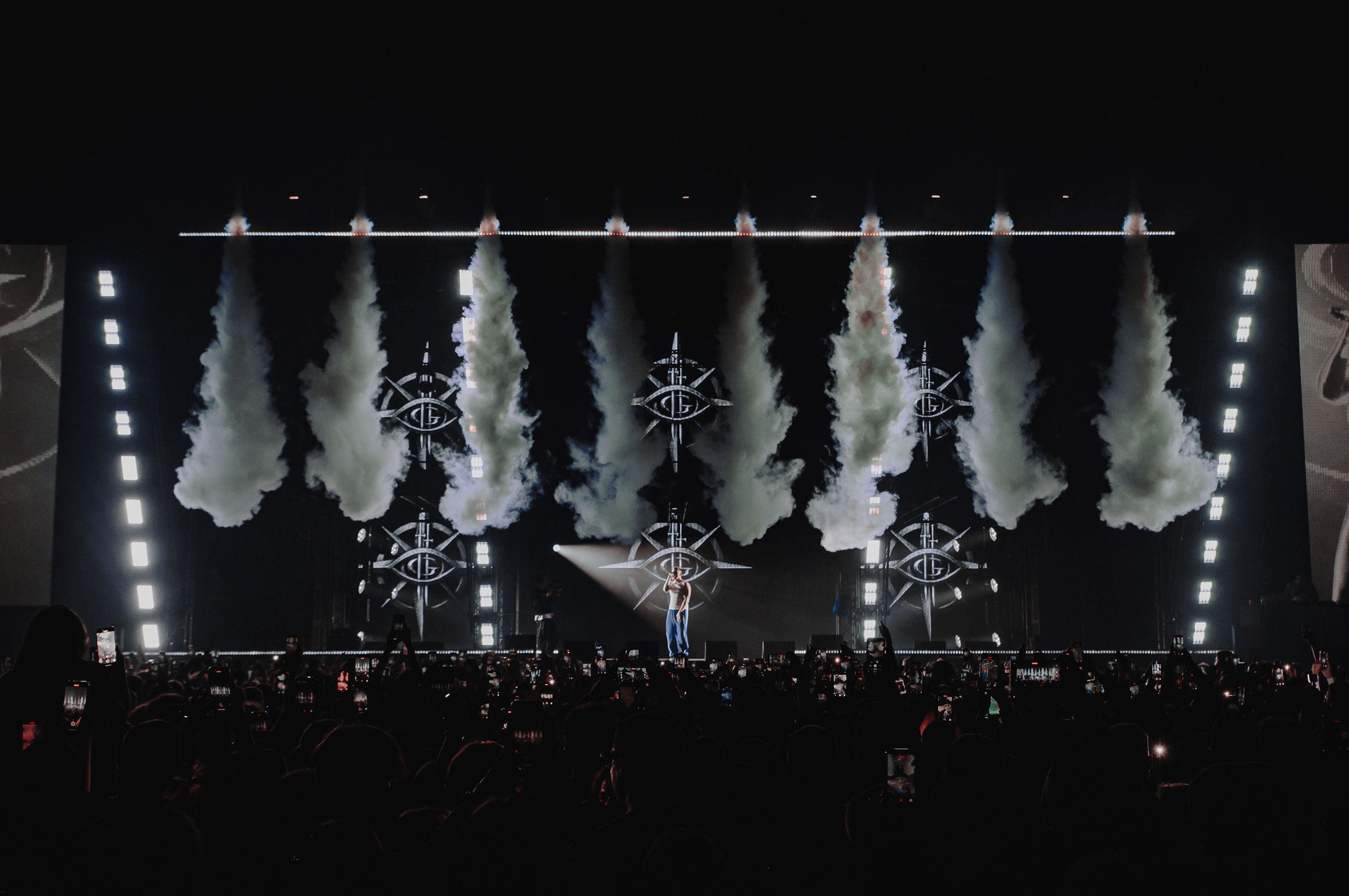 Разработать сценический дизайн с двухэтажной конструкцией: верхний ярус работает как площадка для хореографии, нижний — как площадка для артиста. Объём передать ультрареалистичным контентом на экранах и плотной дымкой, чтобы световые лучи «резали» пространство слоями и усиливали глубину сцены.