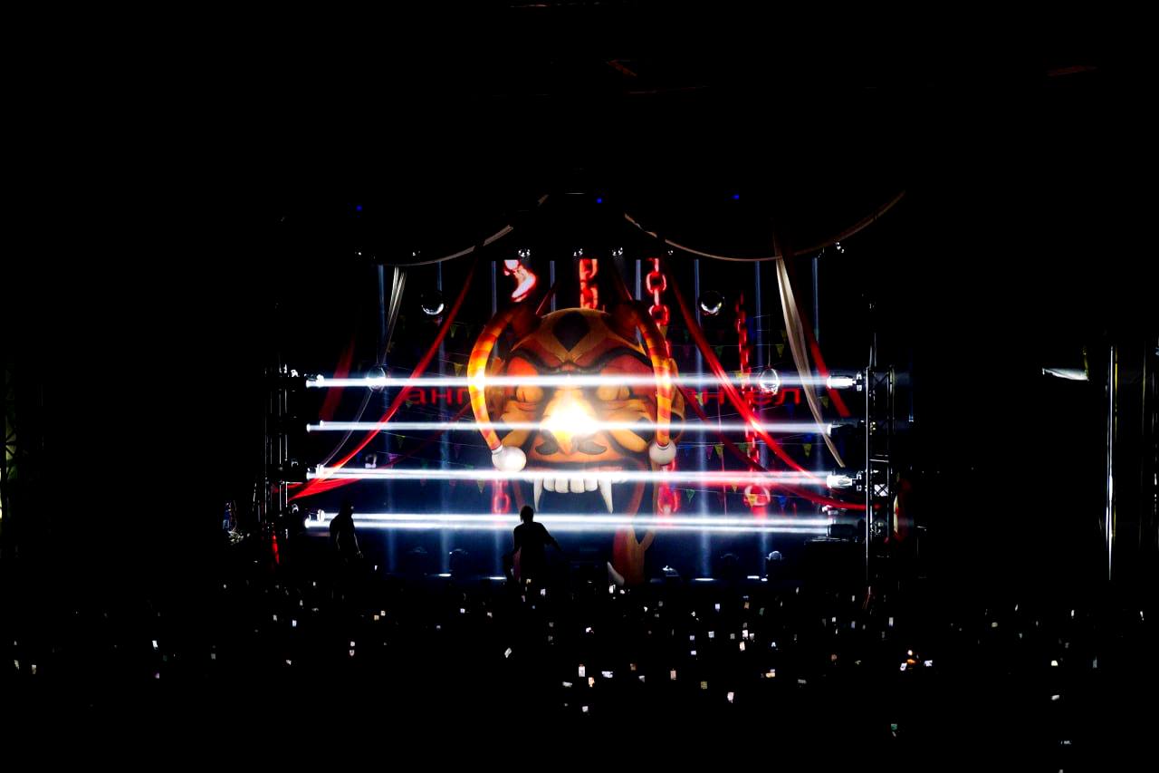 Разработать сценический дизайн, где ключевой образ — большая маска шута. Глубину пространства дополнить световыми слоями, а диско-шарами добавить блики.